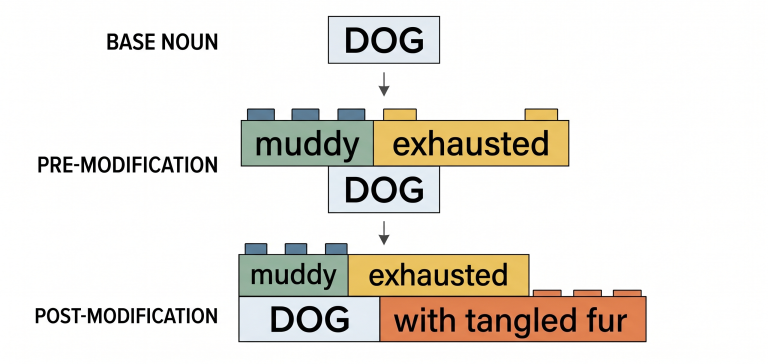 Forgetting post-modification exists. Younger children often stick to pre-modification because it feels natural. From Year 4 onwards, push children to add a prepositional phrase or relative clause after the noun as well. The difference between the old dog and the old dog with cloudy eyes and a slow, heavy tread is significant.