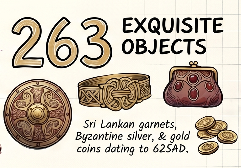 Imported objects show just how connected the Anglo-Saxon world was. A silver dish bears a stamp of the Byzantine Emperor Anastasius I (who reigned from AD 491 to 518). Silver spoons are inscribed in Greek. A bronze bowl came from the Middle East. The deep red garnets set into the gold jewellery and the helmet’s decorative panels are thought to have originated in Sri Lanka or India. Gold shoulder clasps were modelled on the ceremonial dress of Roman emperors, suggesting the king was deliberately associating himself with the prestige of the fallen empire. According to Britannica, these items together demonstrate that the Anglo-Saxons had far-reaching trade contacts – hardly the picture of an isolated, backward people.